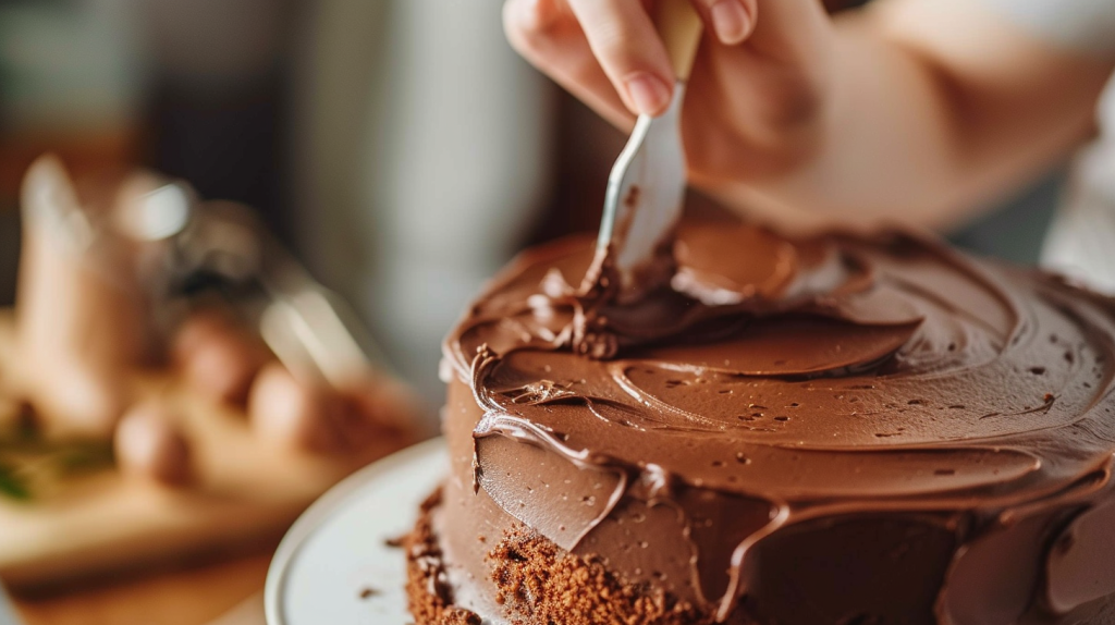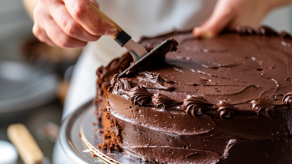 - Pour remaining frosting over the cake, smoothing it over the top and sides until fully covered.