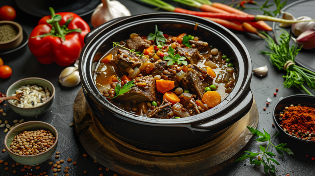Pour the canned tomatoes, chicken stock, lentils, and pearl barley into the slow cooker. Stir gently to combine all ingredients.