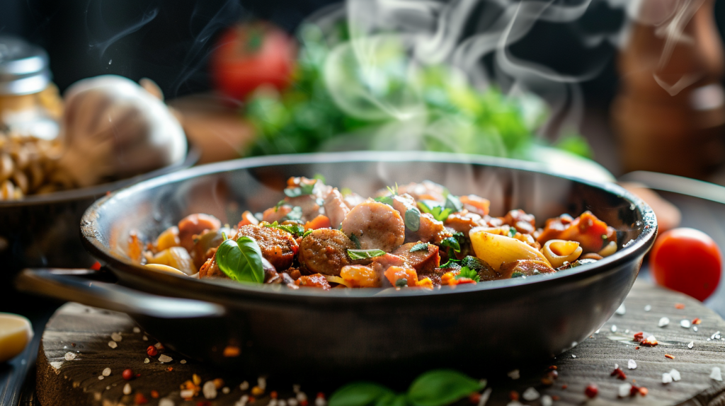 This hearty dish is rich in protein from the sausage and provides a good source of carbohydrates from the pasta. The tomatoes add vitamin C and lycopene, while the olive oil contributes heart-healthy monounsaturated fats.