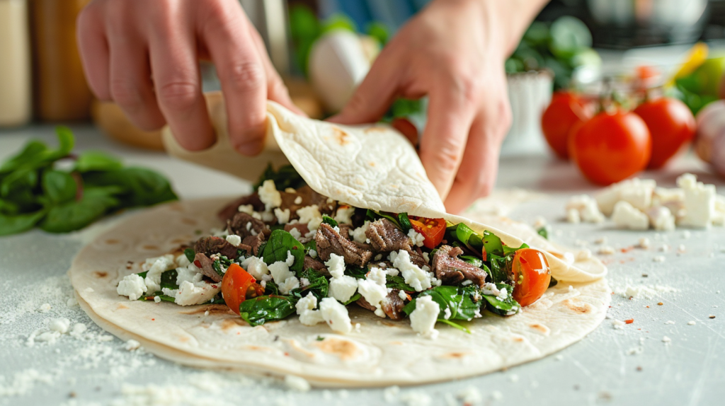 Lay out your four tortillas or flatbreads on a clean work surface. Divide the beef mixture evenly among them, spreading it over one half of each wrap. Top the beef with a generous handful of baby spinach leaves and sprinkle with crumbled feta cheese.